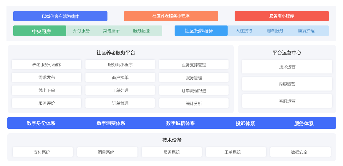 創(chuàng)新“家社院互融”養(yǎng)老模式,基于“社區(qū)養(yǎng)老之家”提供“中央廚房、社區(qū)日托“等兜底服務(wù),建設(shè)健康小屋新形態(tài)。同時吸納周邊服務(wù)商,依托養(yǎng)老機構(gòu)護理能力,整合五大類智能終端,形成10大類300多項生活幫助、家庭床位、適老化改造、居家安防等專業(yè)、個性、便利的養(yǎng)老服務(wù)。輻射3公里范圍內(nèi)居家老人,通過呼叫中心提供24小時守候式服務(wù),為老人、子女、社區(qū)、政府提供支撐。